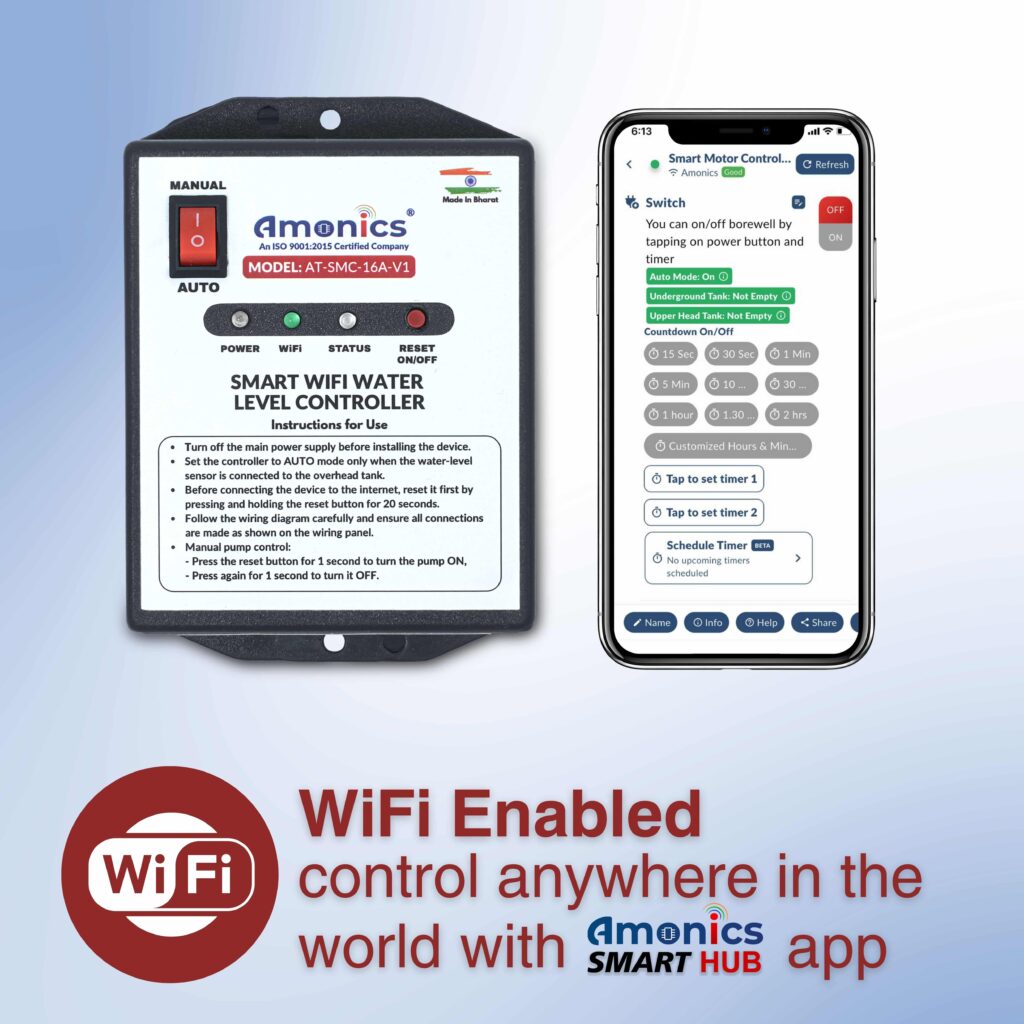 The Amonics WiFi Water Level Controller & Indicator with Sensor is a smart solution for modern homes. Featuring dry run protection, overflow control, and timer scheduling, it ensures efficient water management with app-based ON/OFF anytime, anywhere