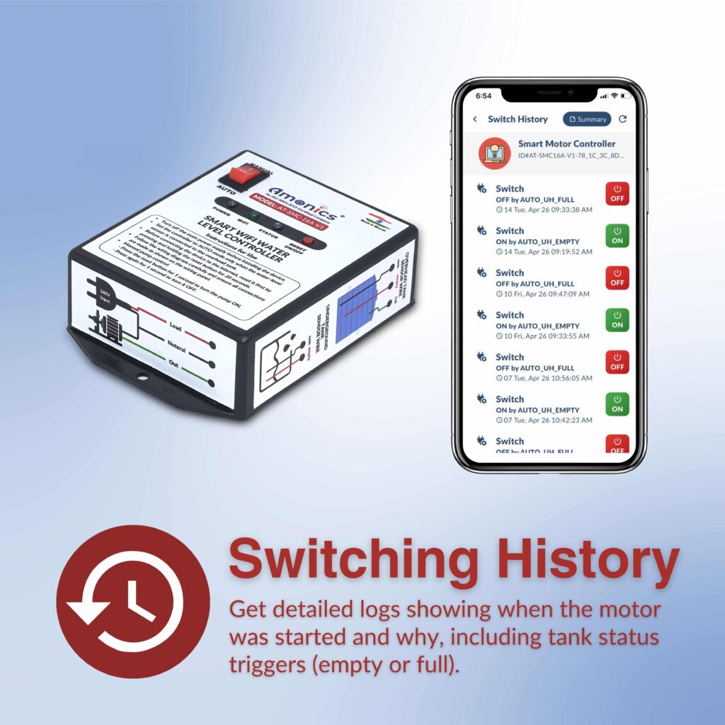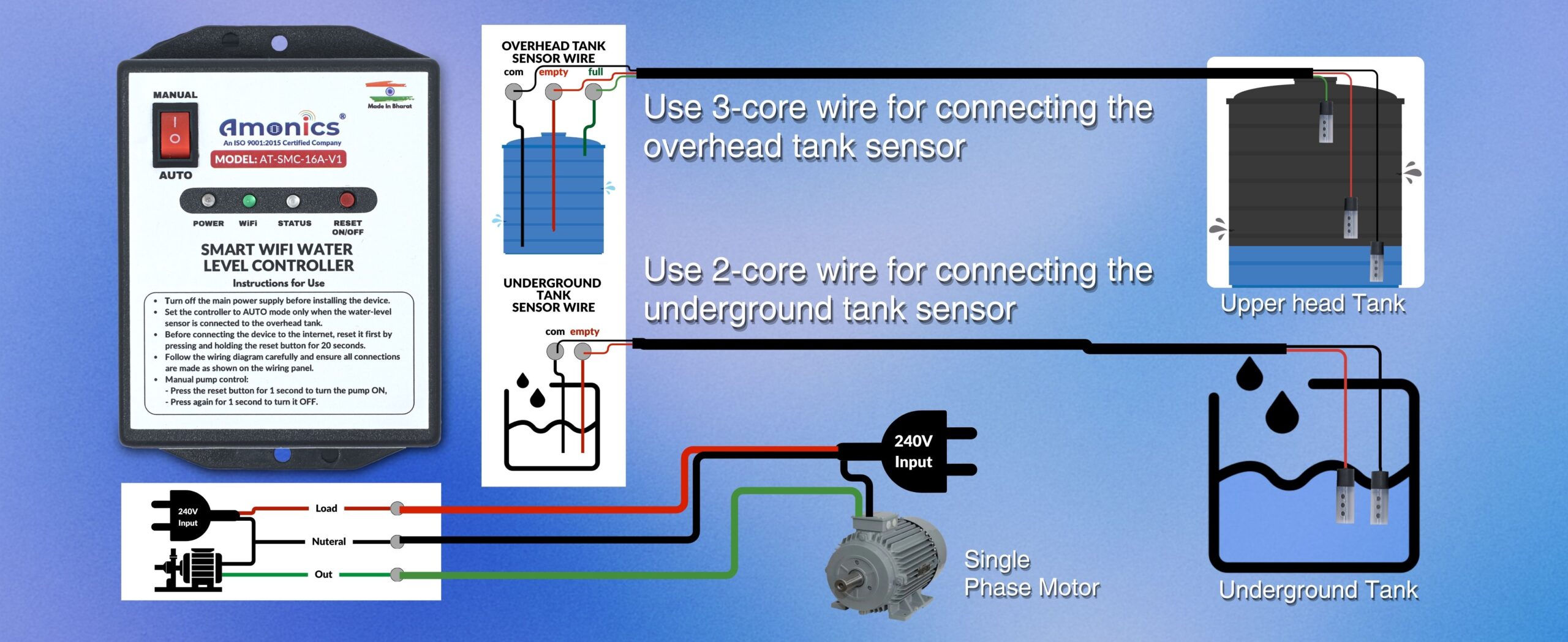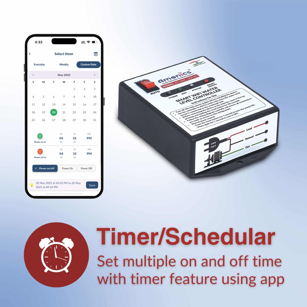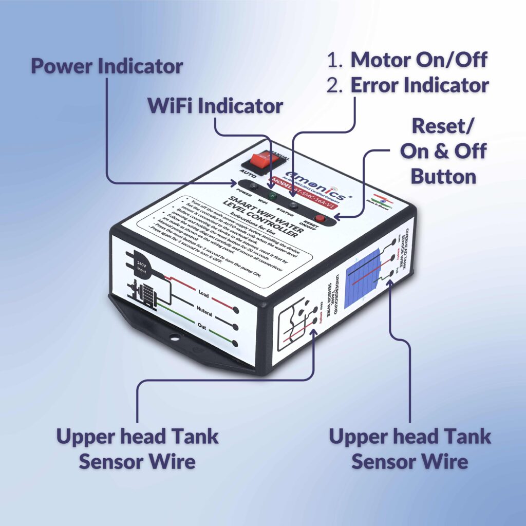 The Amonics WiFi Water Level Controller & Indicator with Sensor is a smart solution for modern households, designed to eliminate water wastage and protect your motor. With 5 advanced carbon sensors, dry run protection, overflow control, and intelligent timer scheduling, this controller ensures automatic motor ON/OFF based on tank levels. Easy to install and fully app-enabled, it gives you complete control anytime, anywhere – making water management effortless and efficient