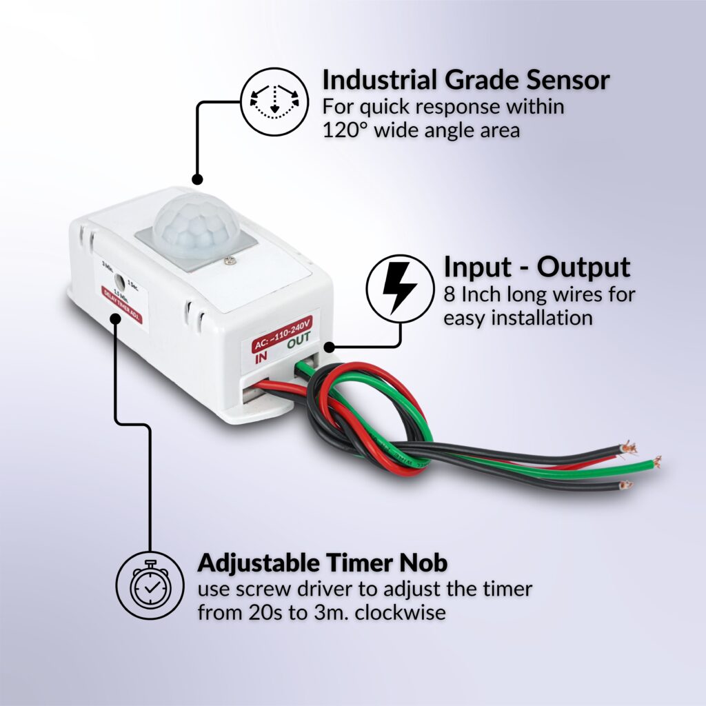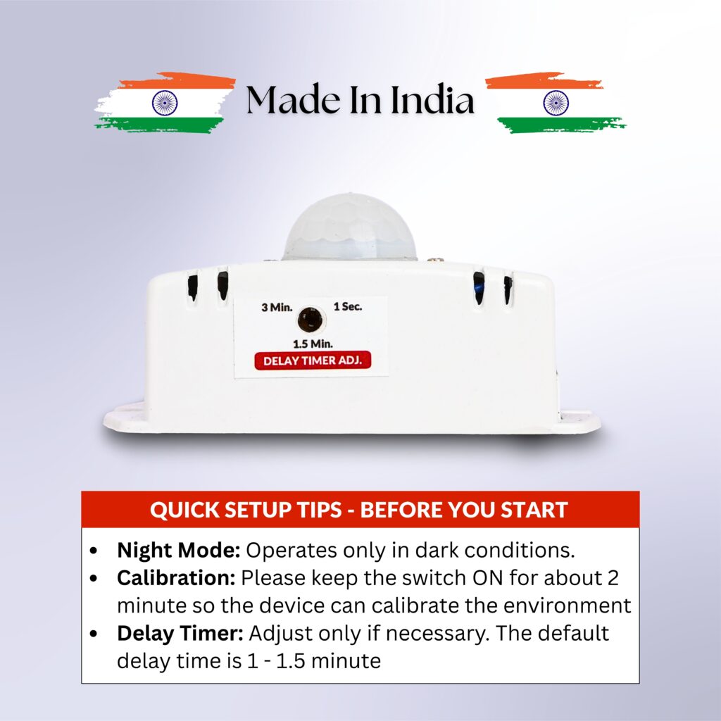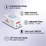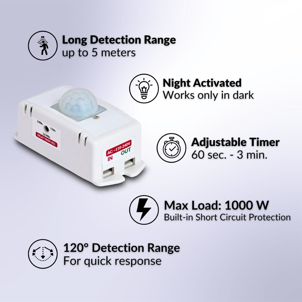 Compact in size to fit in all type of appliances with max load capacity up to 500 watt, inbuilt surge and overload protection, 5-7 meter sensing range, works in night only